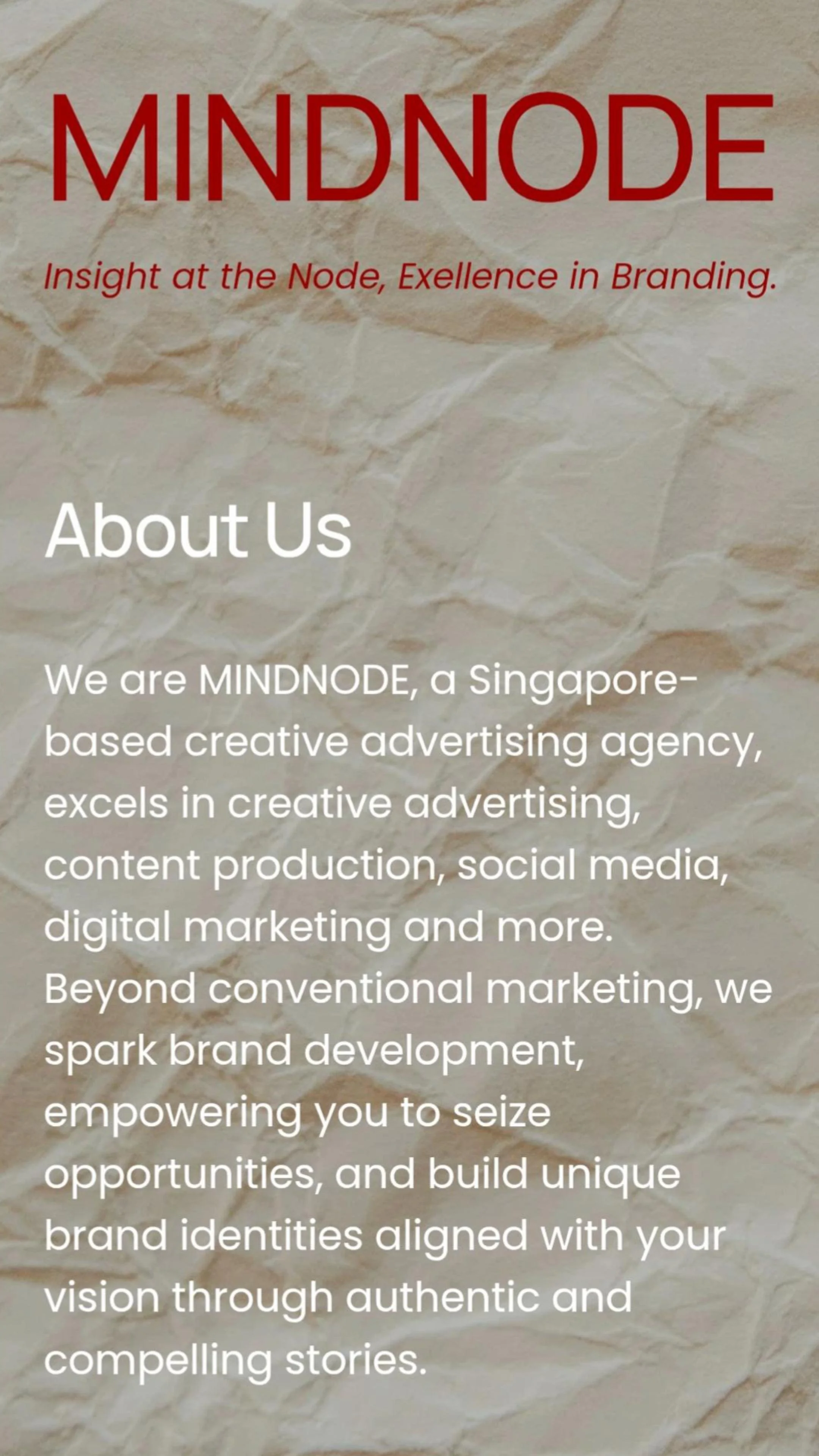We are MINDNODE, a Singapore-based creative advertising agency, excels in creative advertising, content production, social media, digital marketing and more. Beyond conventional marketing, we spark brand development, empowering you to seize opportunities, and build unique brand identities aligned with your vision through authentic and compelling stories.